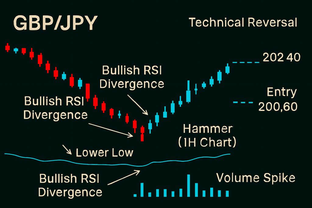 This trade formed after GBP/JPY dropped sharply, creating an oversold RSI reading around 27. However, price made a lower low while RSI made a higher low classic bullish divergence. The 1H chart printed a hammer candle with follow-through volume.