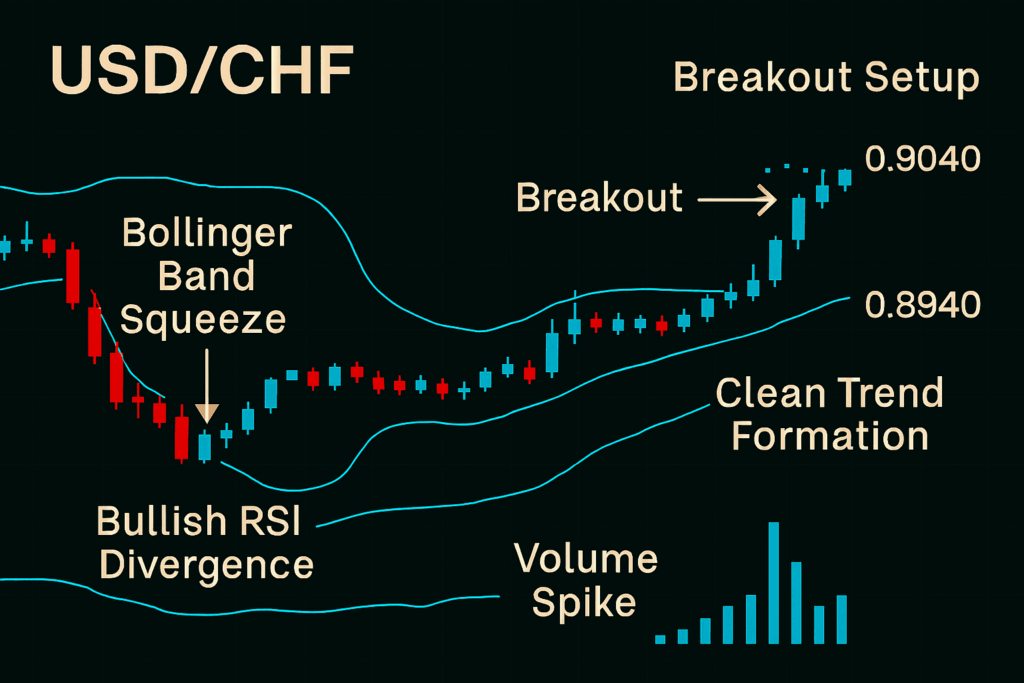 After several days of tight consolidation under 0.8940, USD/CHF broke out with strength. Our breakout system detected the setup early and waited for confirmation: Bollinger Bands expansion, volume surge, and candle body closing above resistance.