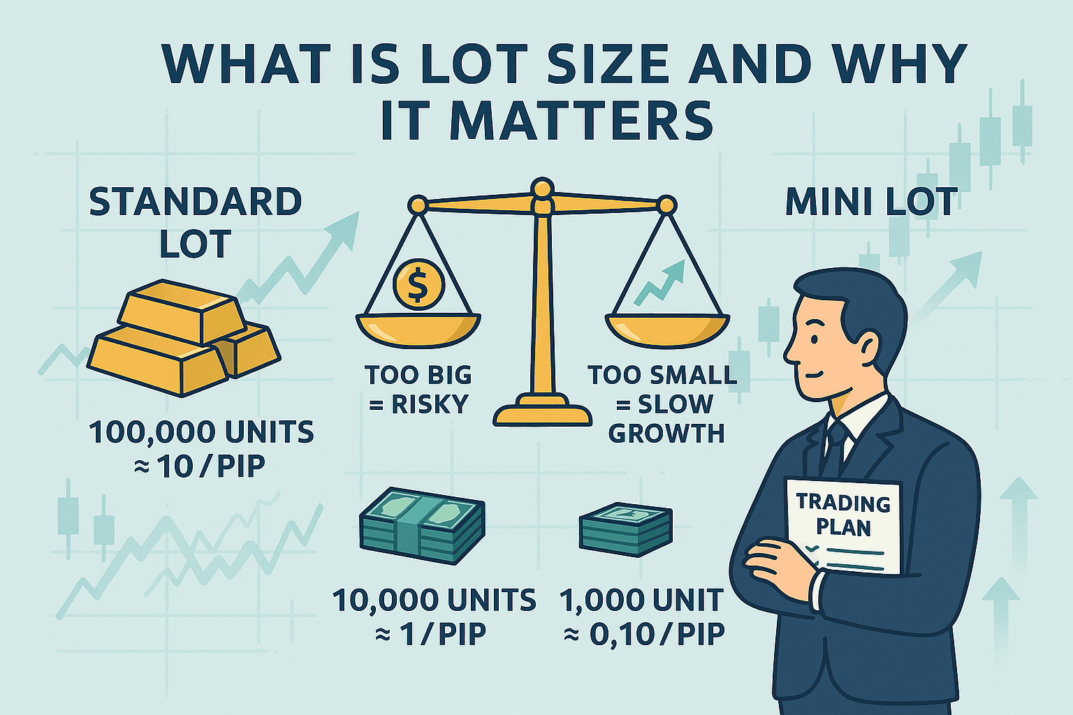 Lot size refers to the volume of a trade in forex. It directly affects how much profit or loss you make per pip.